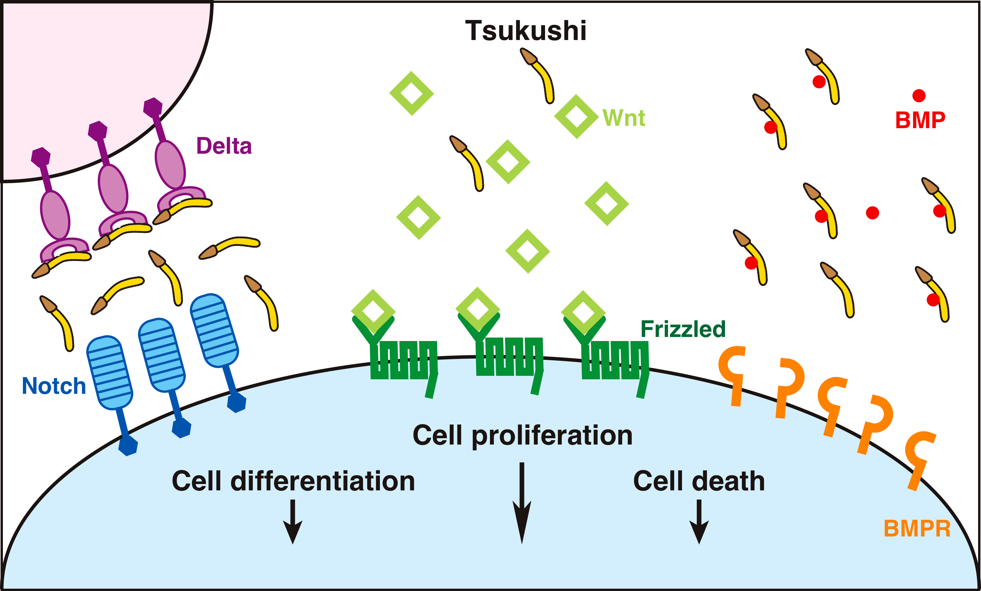 さらに、Tsukushi遺伝子欠損マウスを用いた解析から、Tsukushiが神経回路網形成(Ito et al., BBRC 2010; Hossain et al., Dev. Biol. 2013)や毛周期、皮膚の損傷治癒(Niimori et al., Dev. Biol. 2012)に関与することが見出された。総じてTsukushiは、細胞外領域における多種多様なシグナル伝達経路を制御する仲介因子として様々な発生現象に関与することが明らかになった。(図2:K. Ohta,New Principles in Developmental Processes edited by H.Kondoh and A.Kuroiwa)
