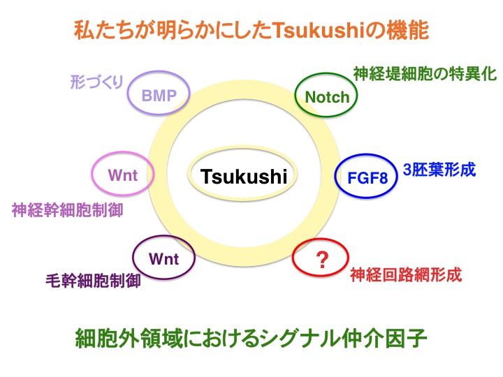 マウス中枢神経系において、Tsukushiは眼の網膜幹・前駆細胞が局在する毛様体や脳神経幹細胞が局在する側脳室下帯や海馬の歯状回に強く発現する。Wntシグナル阻害因子としてTsukushiが網膜幹・前駆細胞の増殖を制御し、ニッチ分子として機能することが明らかになり(Ohta et al., PNAS 2011)、脳神経幹細胞の制御においても同様の機能が期待されている。(Ito et al., in preparation)